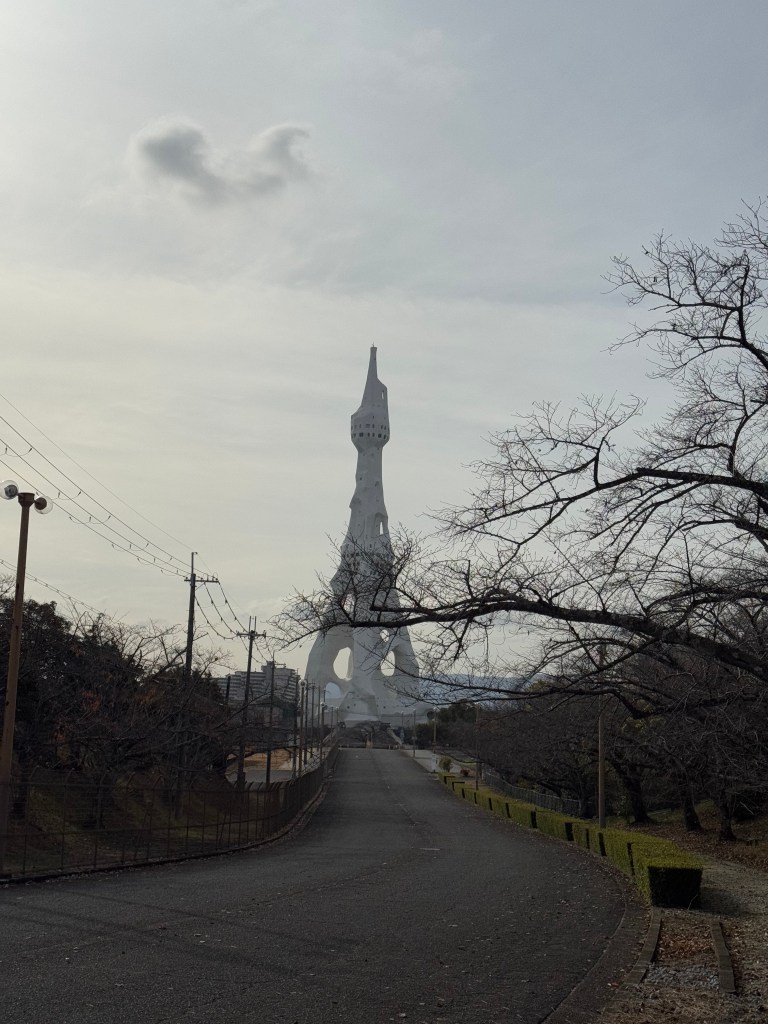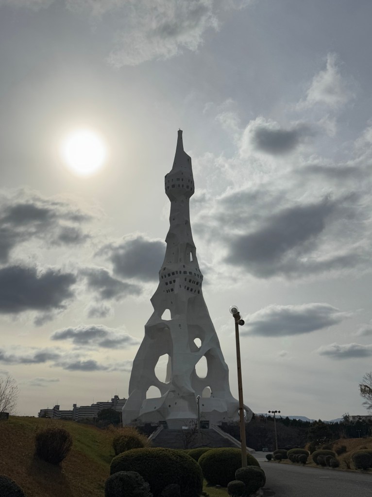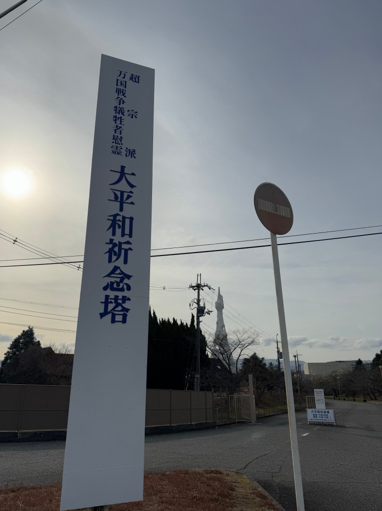 Much unlike Bentenshu, the PL Kyodan campus was fairly accessible. I took a bus from Tondabayashi station and got off at the PL byoin-Minami, i.e. PL hospital-South (PL病院南) bus station. PL hospital was a local hospital owned and run by PL Kyodan, the same for an enormous golf course engulfing the area. On the back side of the PL hospital was a grass plain, with the main building of PL Kyodan sitting solemnly on one end. There was a guard post before its campus, and I decided to not try my luck getting closer to it. Across the road stood the place that had captured my interest for several months — the PL Tower (PLタワー). That wasn’t its original name, though; its full, much longer title (as seen in the photo below) literally translates to something like: ‘The Great Cenotaph Tower for Peaceful Prayers to Console the War Dead of All Nations and Religions’ (超宗派万国戦争犠牲者慰霊大平和祈念塔).