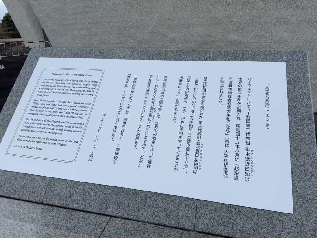 The Second Founder of the Church of Perfect Liberty the late Rev. Touchika Miki Hijiri in August 1970 built the Great Peace Tower, Commemorating and Consoling All Victims of War Throughout the World, Regardless of Race or Religion, praying for eternal world peace.